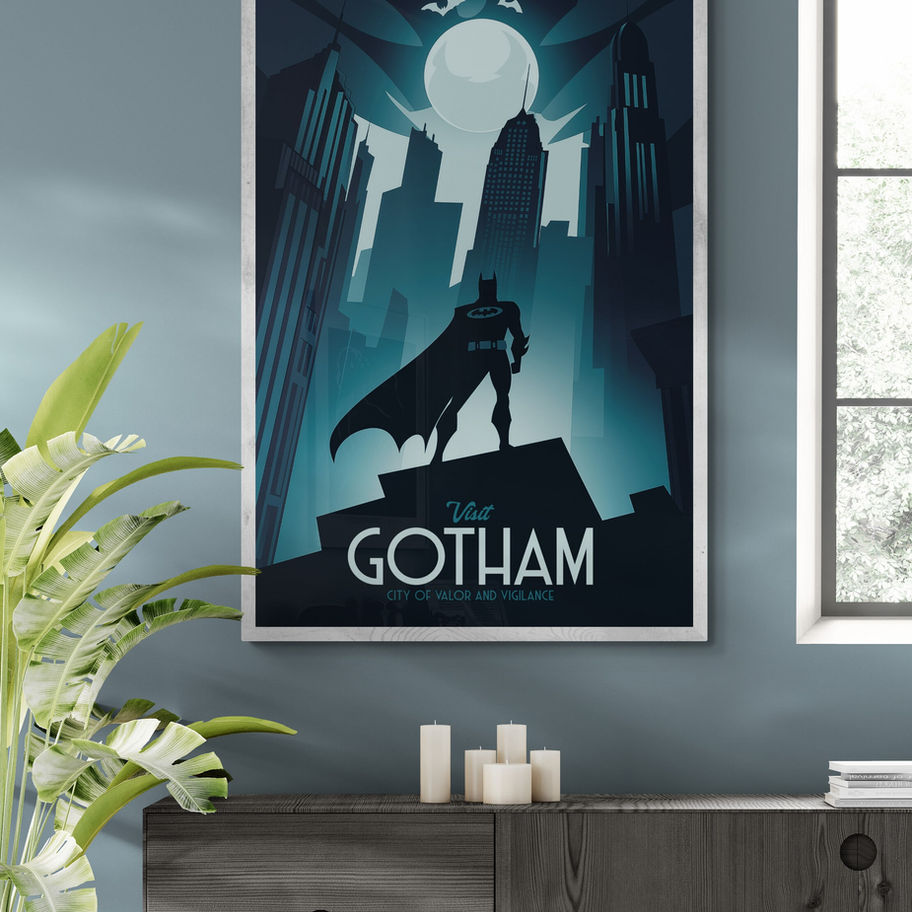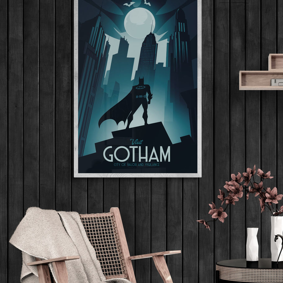 Explore the shadowed streets of Gotham with this striking travel poster, inviting you to “Visit Gotham: City of Valor and Vigilance.” Depicting the iconic silhouette of Batman standing vigilant over the towering skyline, this art piece captures the essence of Gotham’s dark allure and its steadfast protector. Did you know Gotham’s name was inspired by a nickname for New York City in Washington Irving’s writings?